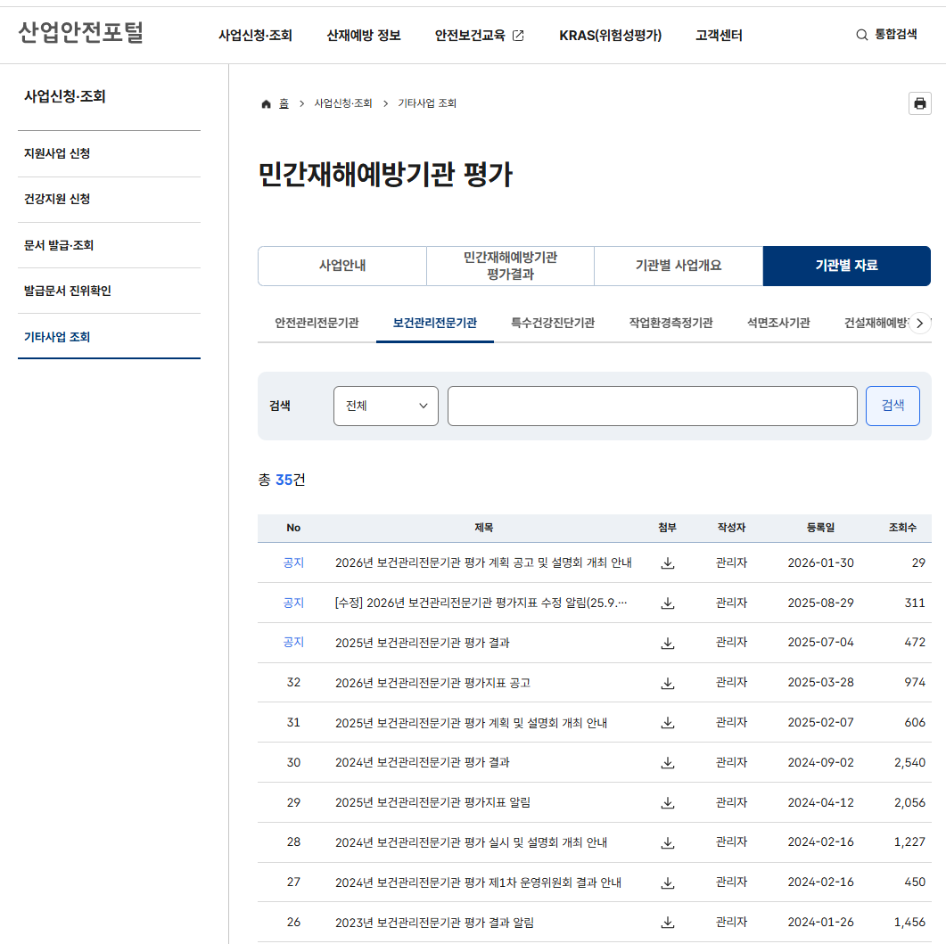안전보건공단에 2026년 보건관리전문기관평가 계획이 공고 되었습니다. (링크)